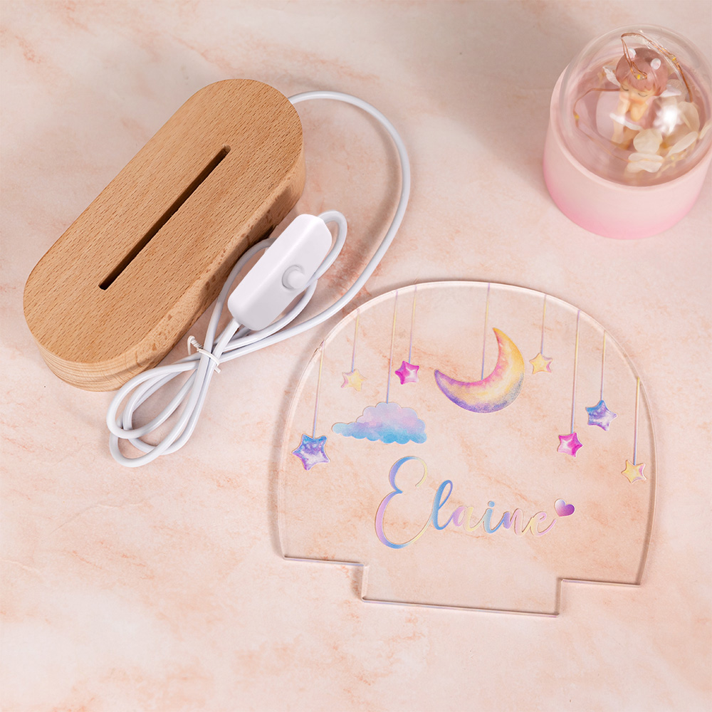 Personalized Name - The Custom Name Colorful Moon & Stars Night Light features a unique acrylic plaque that can be personalized with your child's name, making it a special addition to any nursery or bedroom.